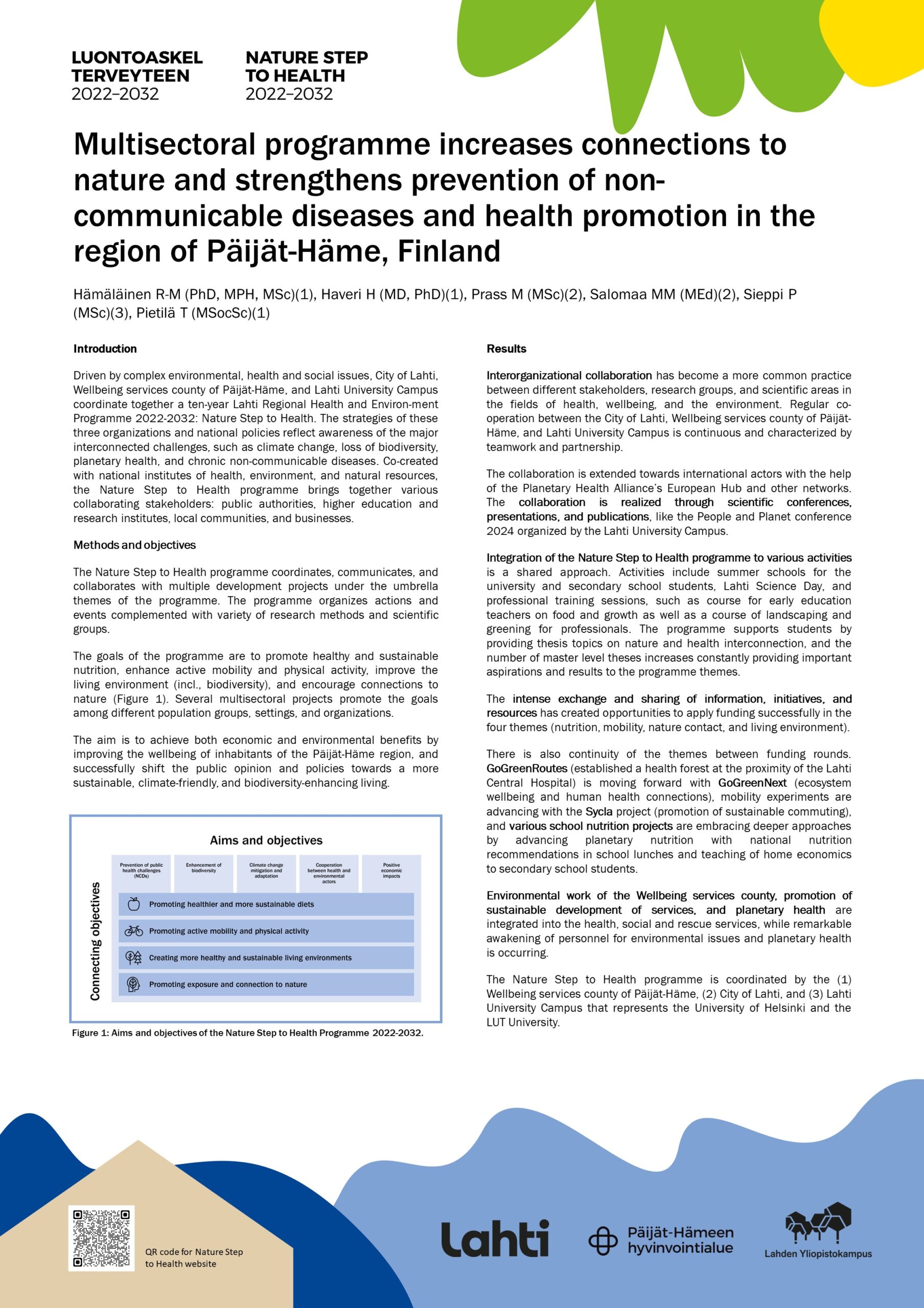 Nature Step to Health Programme is a Lahti Regional Health and Environment Programme for 2022-2032. The 10-year-programme integrates health and environmental goals of the region of Päijät-Häme in Southern Finland.