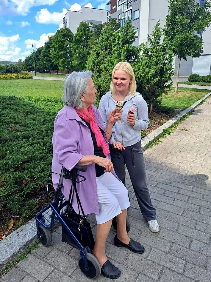 Moni kotihoidon asiakkaista on paljon yksin omassa kodissaan ja nauttivat erityisesti kun pääsevät nauttimaan Suomen kesästä. Carita on ulkoillut paljon asiakkaiden kanssa, samalla ollaan jutusteltu ja käyty vaikka jätskillä.